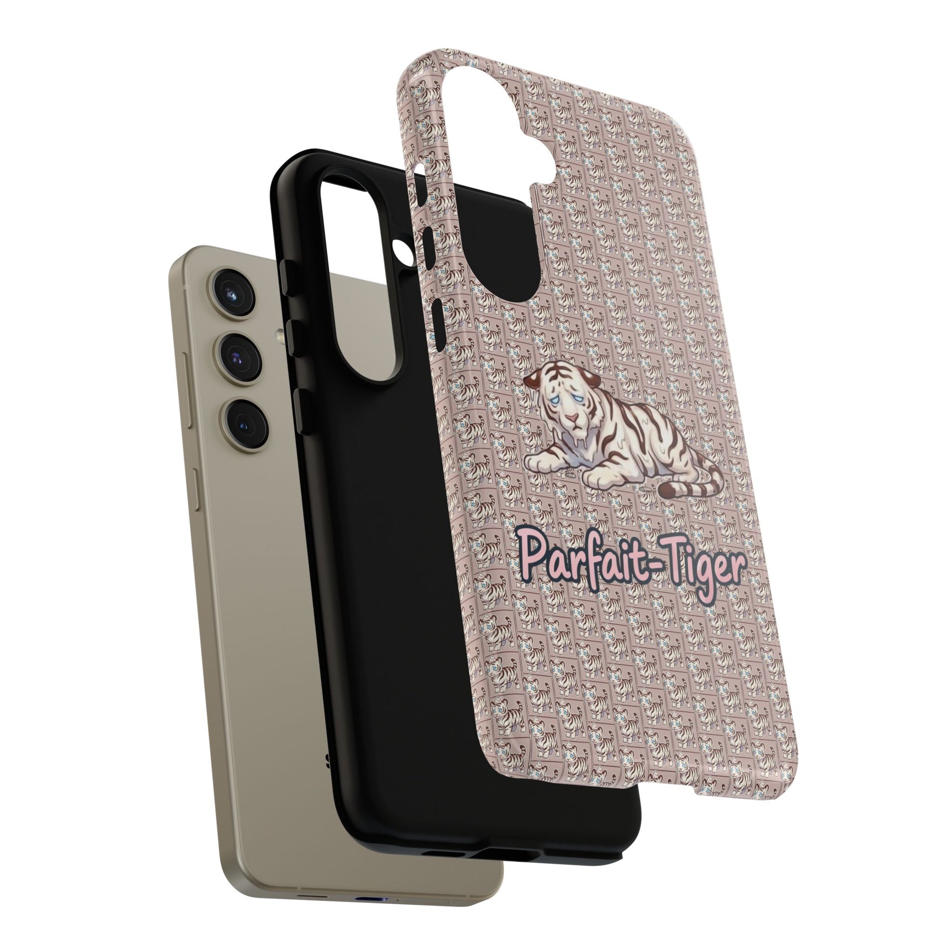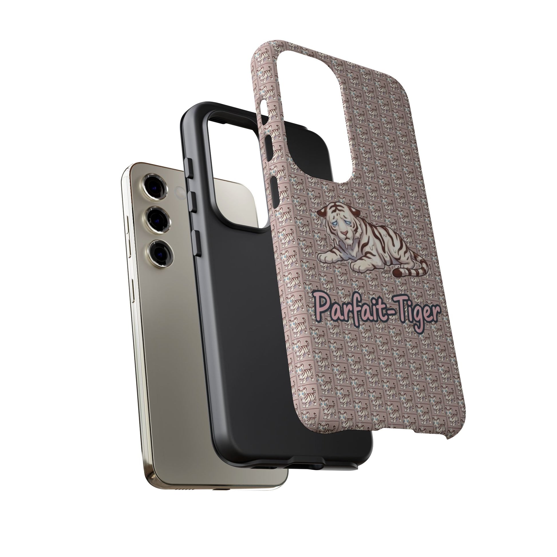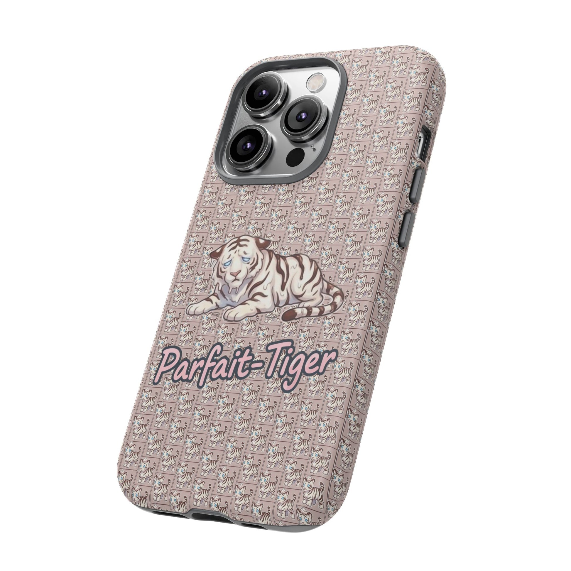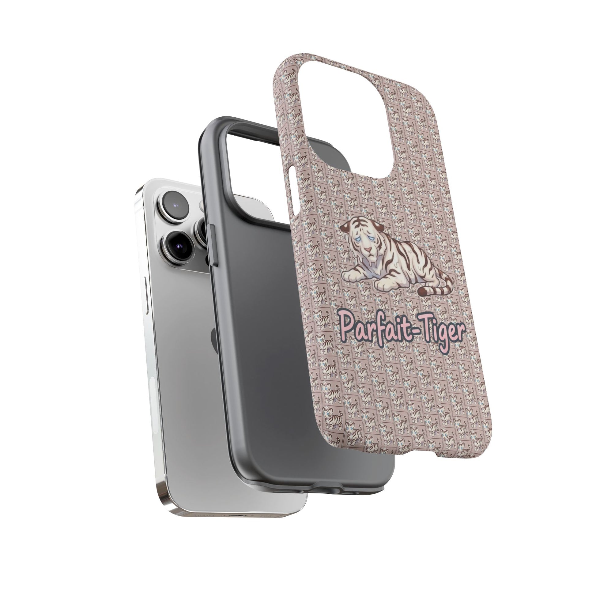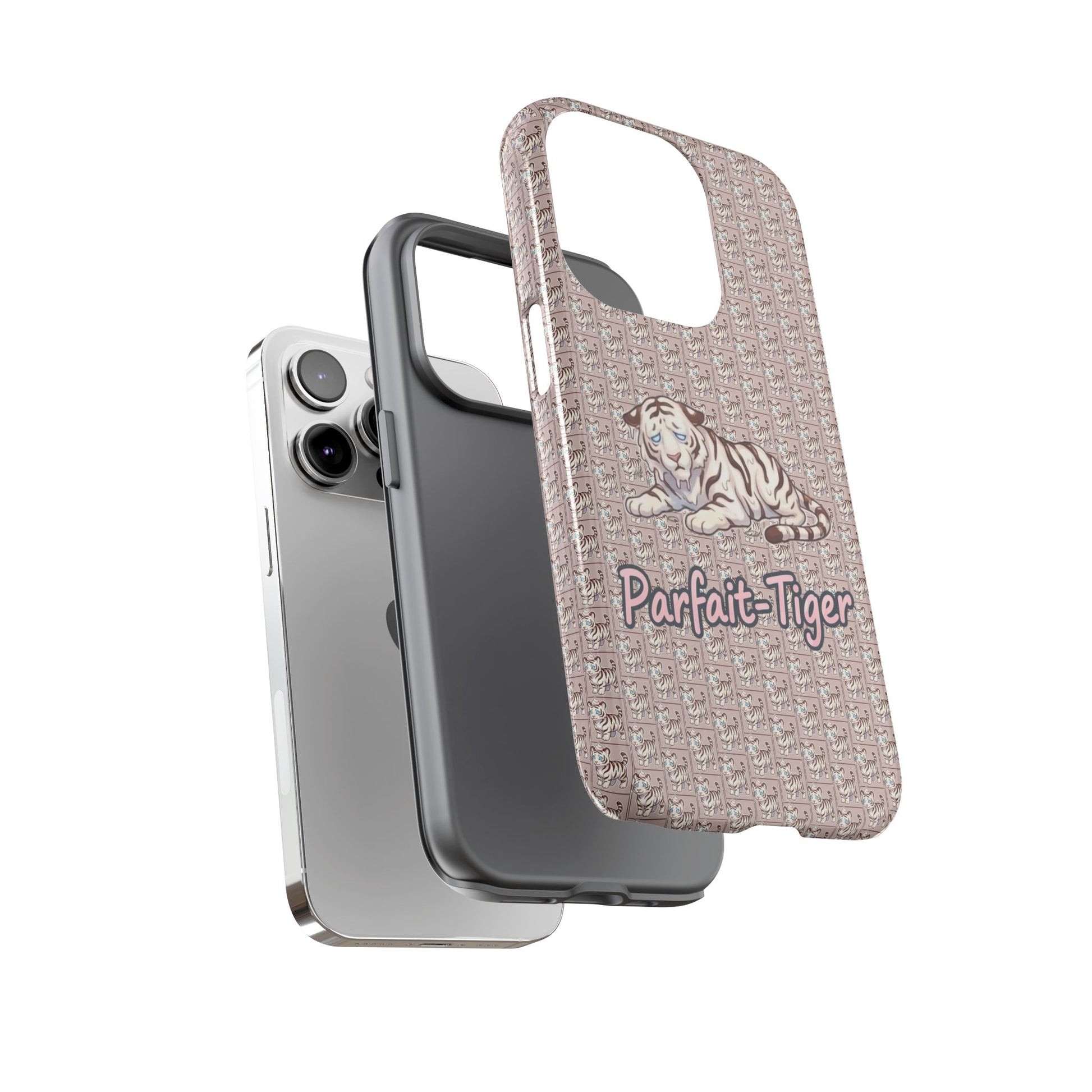 A slim, protective phone case that brings vintage charm and soft whimsy to your everyday carry. The dual-layer shell combines a glossy or matte printed polycarbonate exterior with a TPU silicone liner for shock absorption. A repeating micro-pattern in muted rose-beige sets a textured backdrop for a serene white tiger illustration and the handwritten-style script "Parfait-Tiger," giving the case a cozy, collectible vibe. UV-resistant inks keep the colors true outdoors, and precise cutouts preserve easy access to ports and wireless charging while guarding your phone from drops and scuffs. Subtle luxury with practical protection for someone who likes personality on their device.