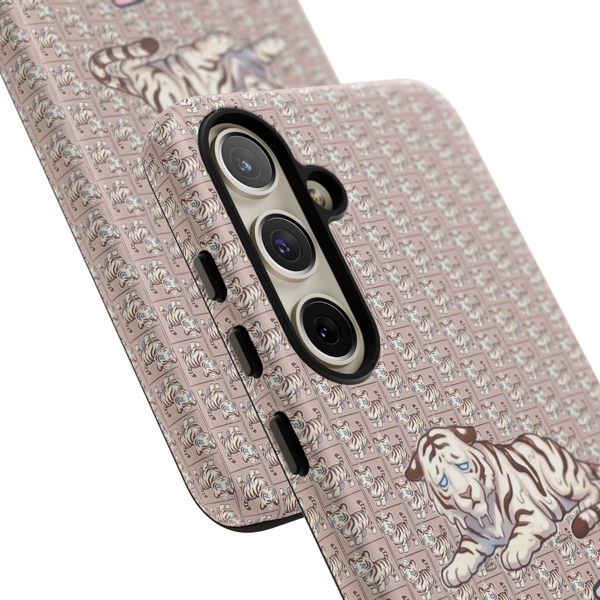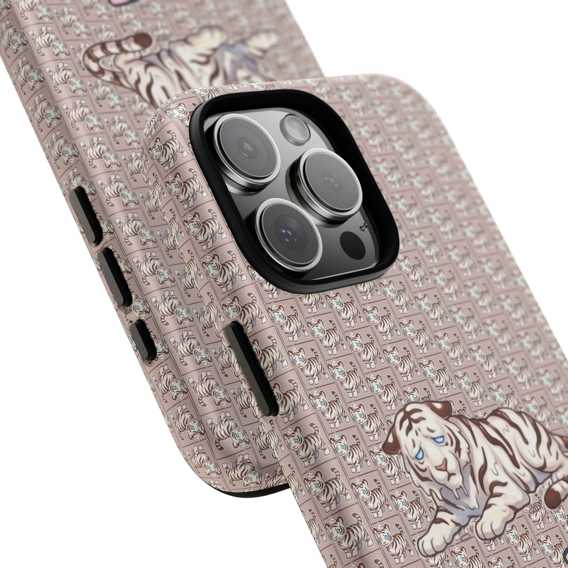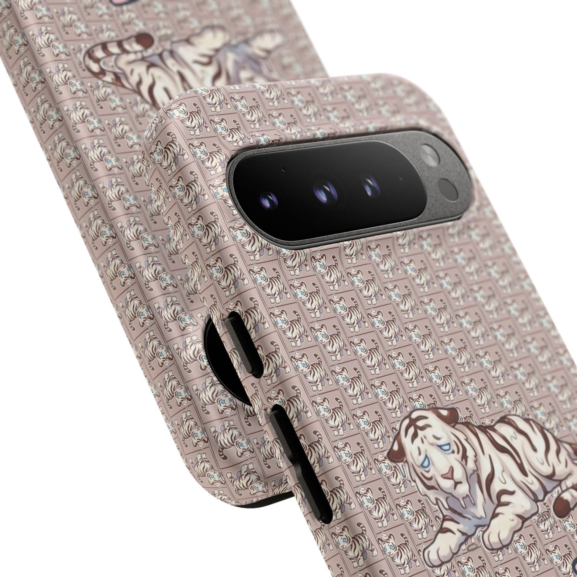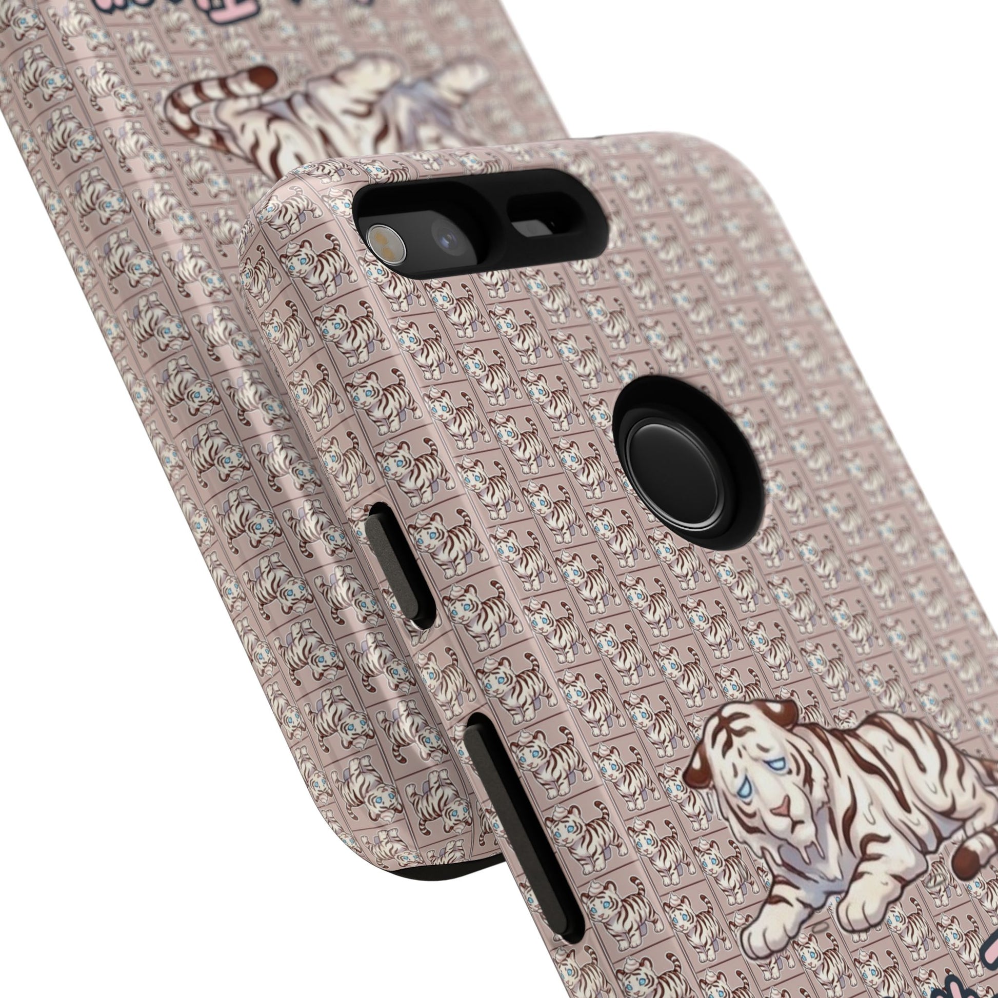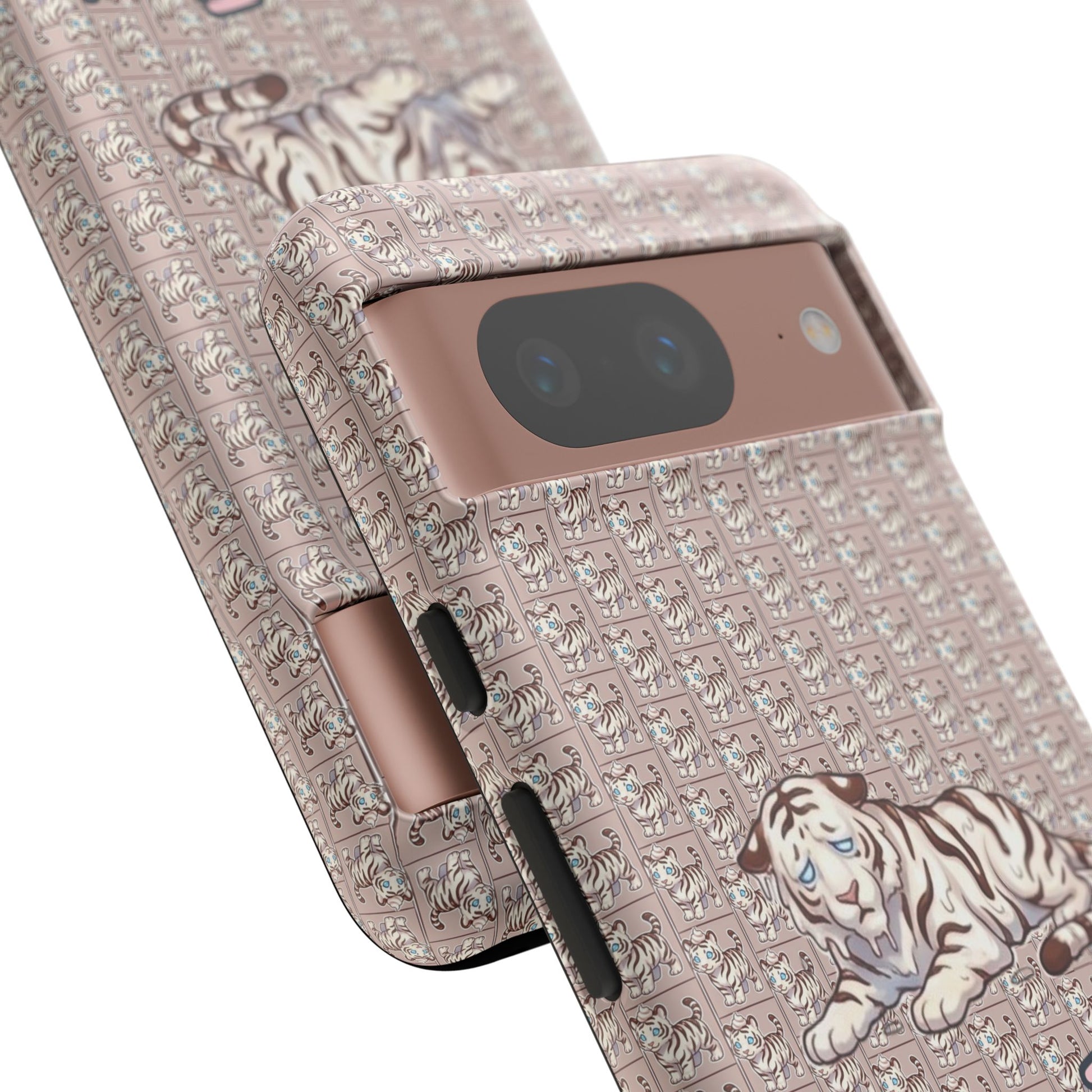 A slim, protective phone case that brings vintage charm and soft whimsy to your everyday carry. The dual-layer shell combines a glossy or matte printed polycarbonate exterior with a TPU silicone liner for shock absorption. A repeating micro-pattern in muted rose-beige sets a textured backdrop for a serene white tiger illustration and the handwritten-style script "Parfait-Tiger," giving the case a cozy, collectible vibe. UV-resistant inks keep the colors true outdoors, and precise cutouts preserve easy access to ports and wireless charging while guarding your phone from drops and scuffs. Subtle luxury with practical protection for someone who likes personality on their device.