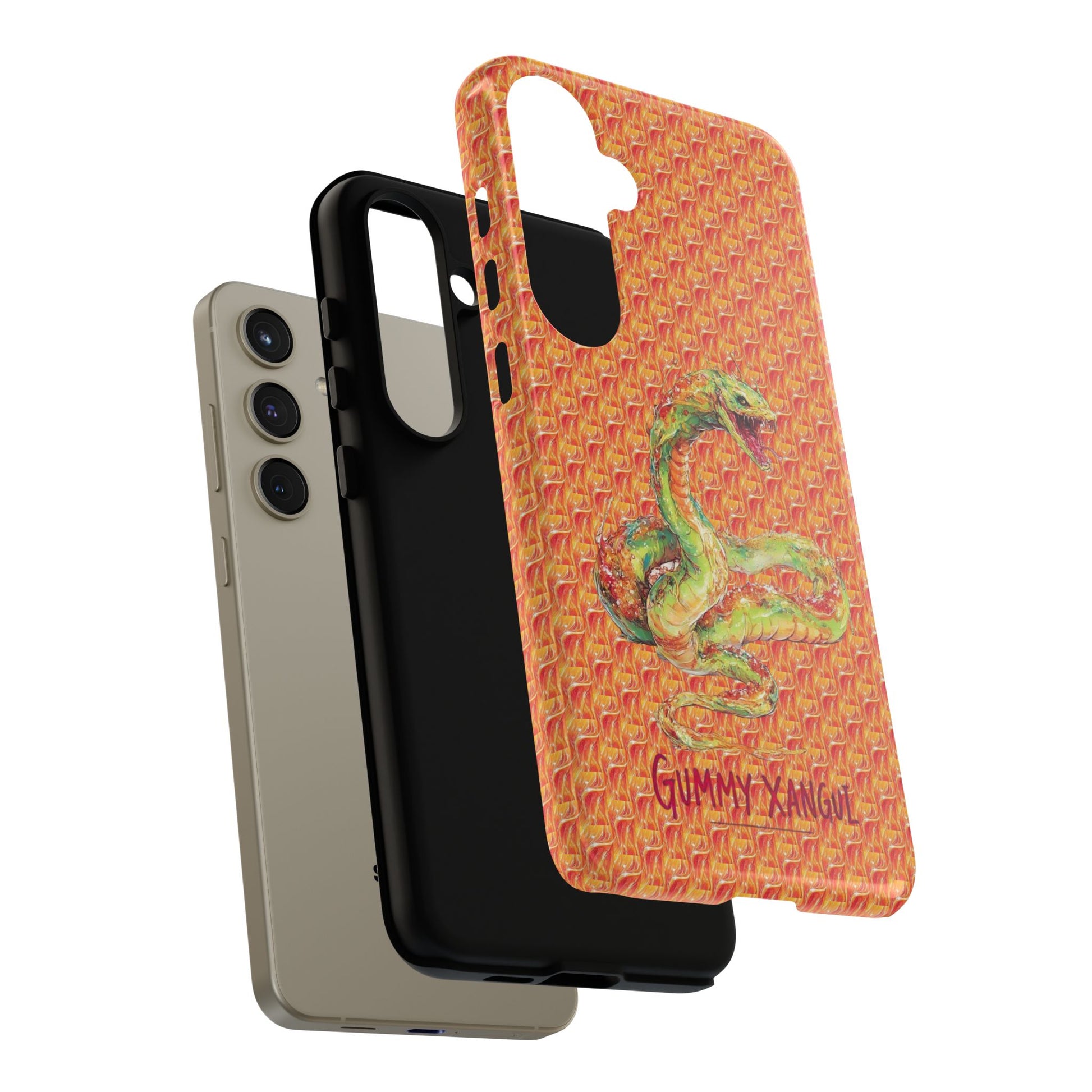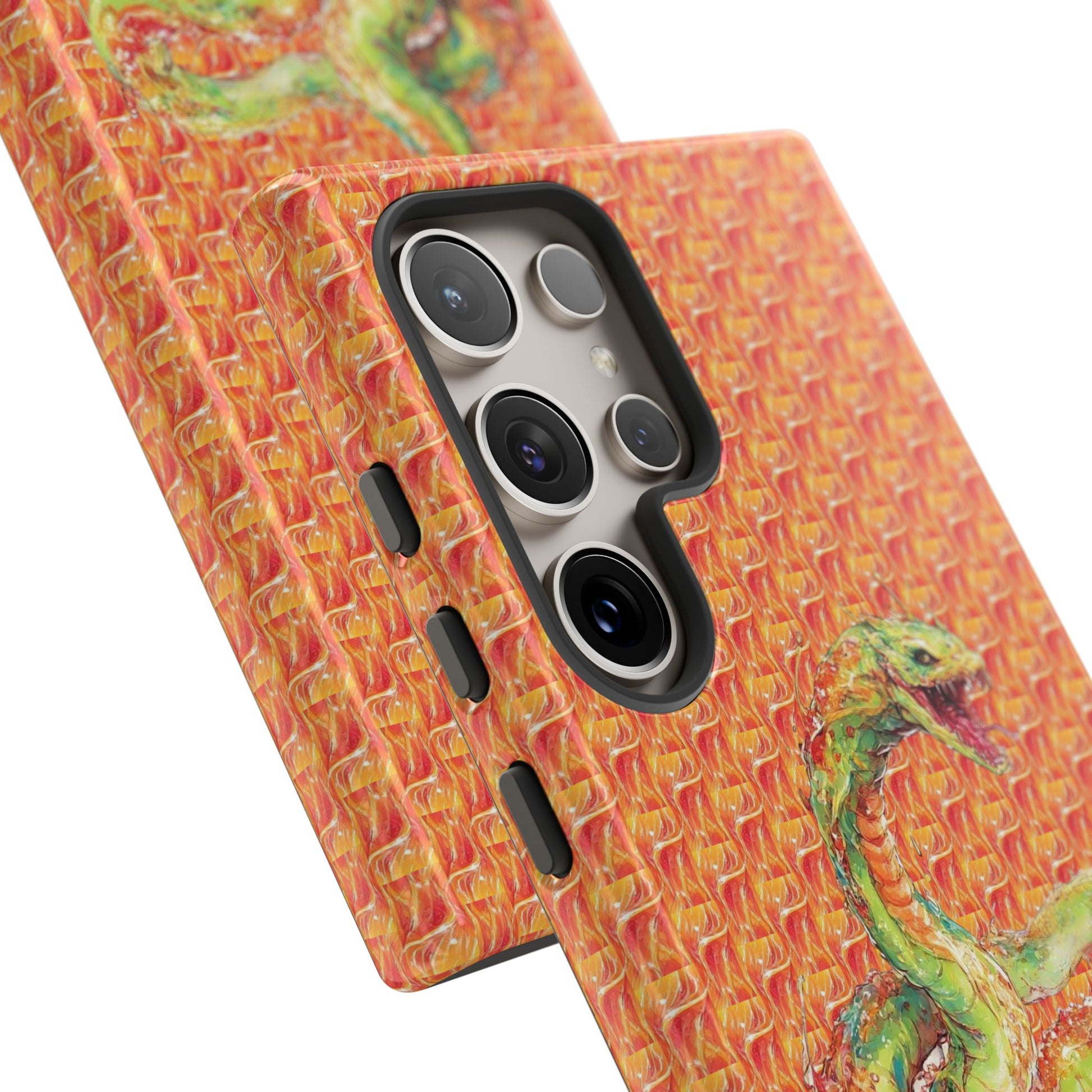 A tough phone case that blends bold personality with real-world protection. The vivid, textured background wraps across the entire shell, framing a hand-drawn green serpent motif that feels equal parts playful and fierce. Light on bulk but built in two layers — a rigid polycarbonate shell and a TPU silicone liner — it absorbs shocks from everyday drops while keeping ports clear and wireless charging usable. Weather-ready UV protection preserves the bright inks outdoors, while glossy or matte finishes let you choose the final look. Small handling notes keep the artwork crisp: avoid high-alcohol liquids, prolonged direct sunlight, and greasy creams.